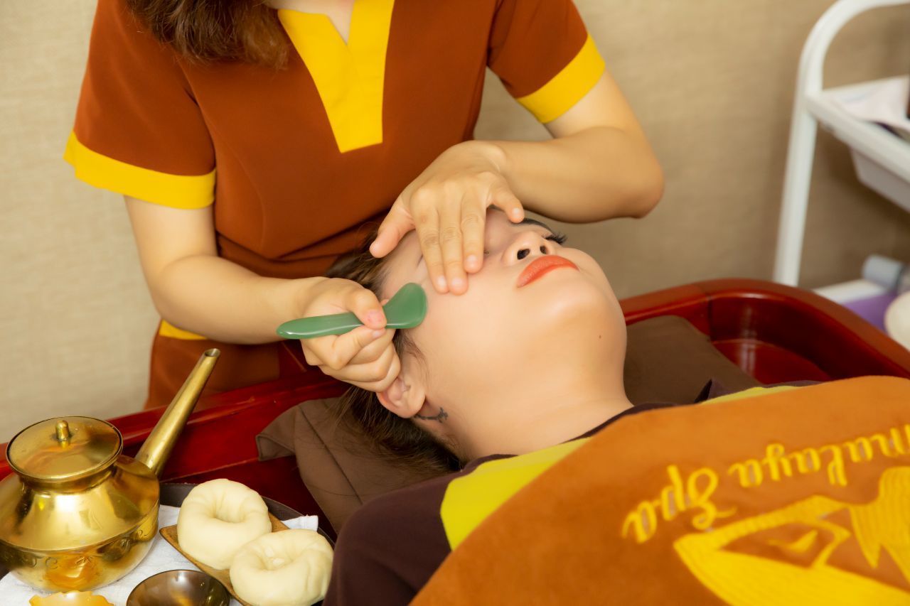 Sử dụng các thanh ngọc quý, chuyên viên sẽ tác động nhẹ nhàng lên các đường kinh lạc trên gương mặt. Thanh ngọc quý không chỉ giúp kích thích tuần hoàn máu mà còn giúp nâng cơ và xóa nhăn hiệu quả. Các động tác massage chuyên sâu kết hợp với sự di chuyển của thanh ngọc giúp thúc đẩy quá trình tái tạo collagen, mang lại làn da căng mịn và săn chắc hơn.