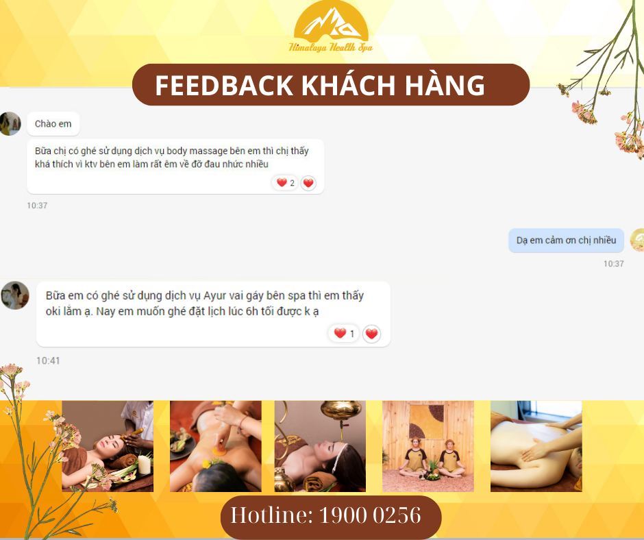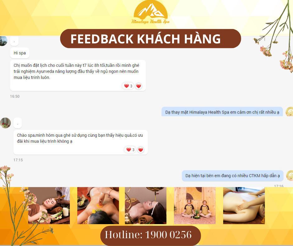 Trong suốt nhiều năm hoạt động và phát triển, Himalaya Health Spa được quý khách hàng tin yêu, và lựa chọn bởi nhiều lý do khác nhau. Chúng tôi đã rất may mắn khi nhận được niềm tin yêu và trân trọng của quý khách hàng. Từng tin nhắn, từng feedback được gửi là là động lực lớn để toàn thể Cán bộ công nhân viên tại Himalaya Health Spa nỗ lực phấn đấu từng ngày.