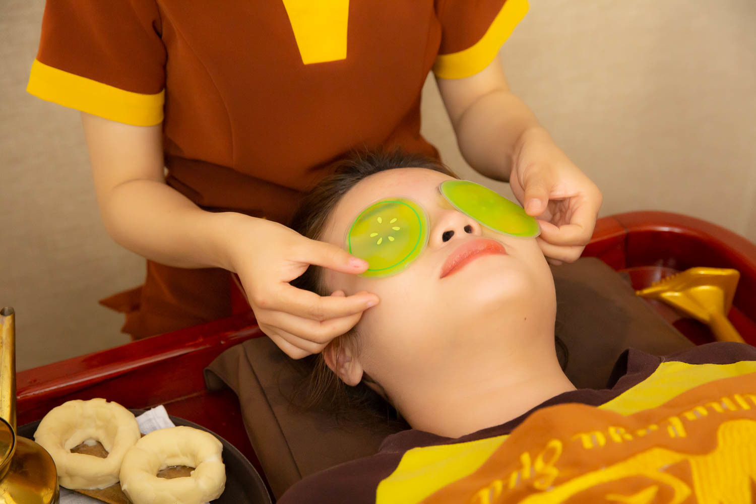 ✧ Bước 13: Đắp mặt nạ ngũ hoa vùng mắt kết hợp lưu thông khí huyết vùng đầu.