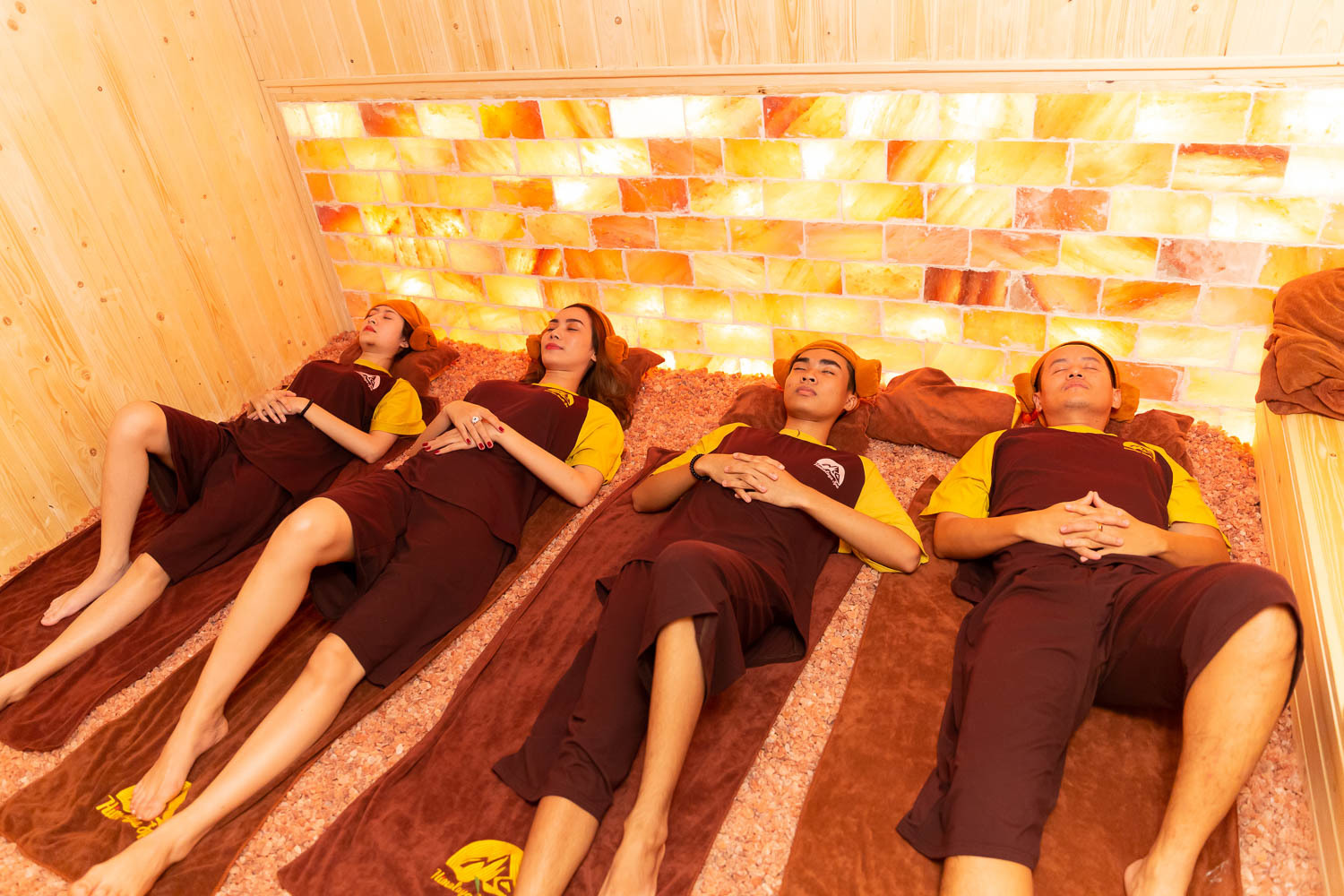 ❥ Bước 03: Ngồi vuông góc, lưng dựa vào tường đá muối, chân co lên sao cho toàn bộ bàn chân tiếp xúc với đá, tay và chân di chuyển trên đá khoảng 05 phút.